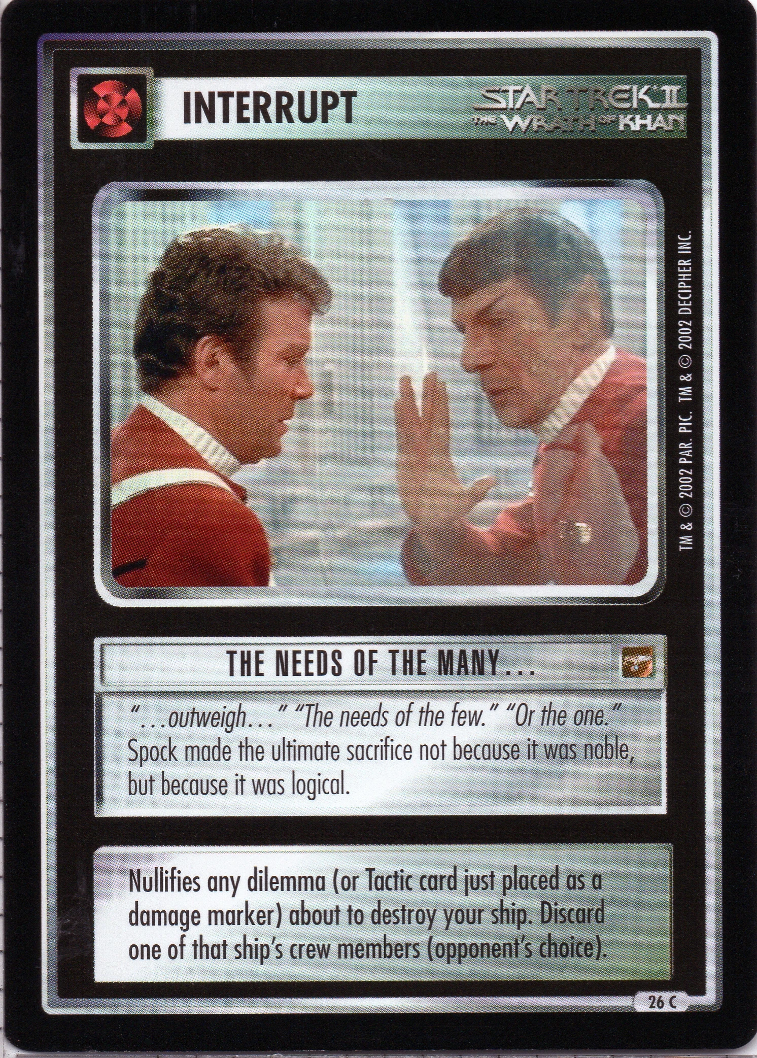 | Lore (Errata) | "...outweigh...." "The needs of the few." "Or the one." Spock made the ultimate sacrifice not because it was noble, but because it was logical. |