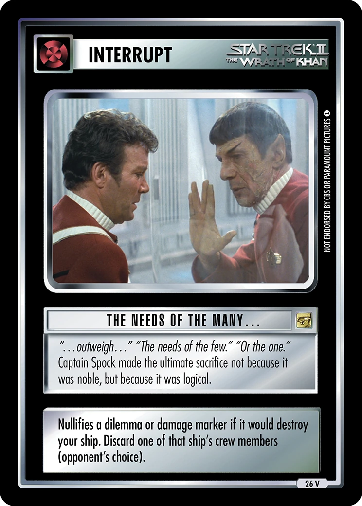 | Game Text | Nullifies a dilemma or damage marker if it would destroy your ship. Discard one of that ship's crew members (opponent's choice). |