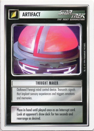 | Lore | Outlawed Ferengi mind control device. Transmits signals that implant sensory experiences and triggers emotions and memories. |