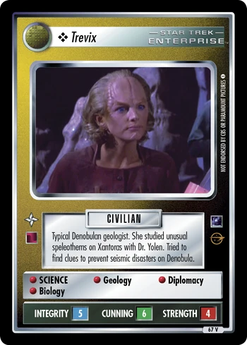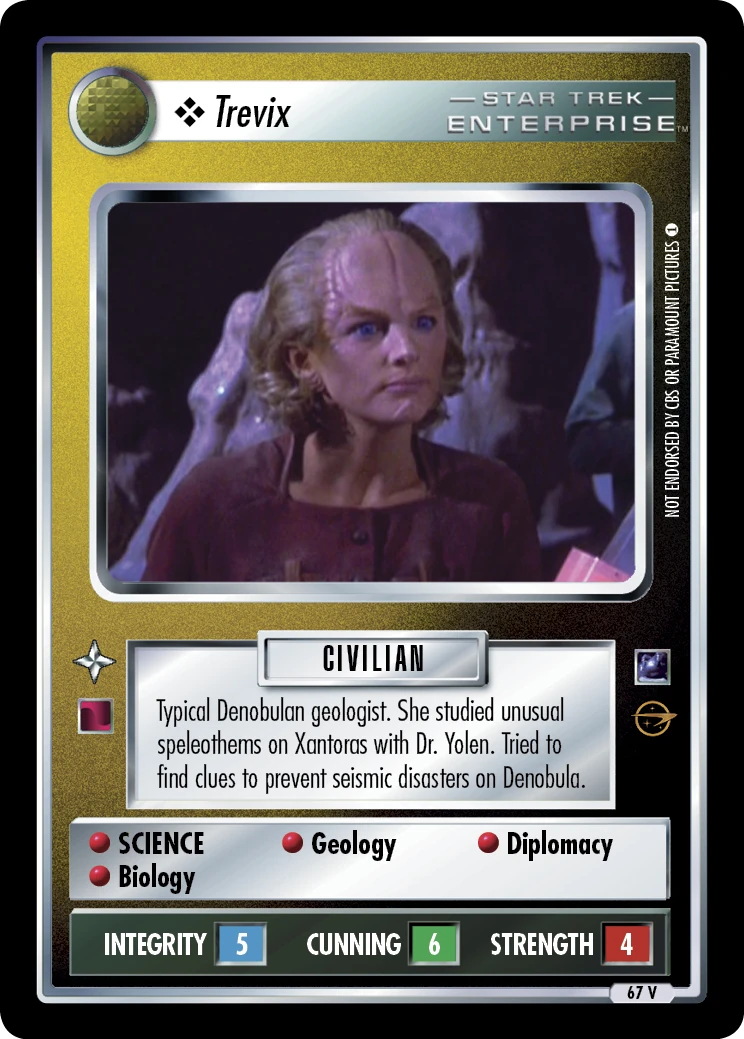 | Lore | Typical Denobulan geologist. She studied unusual speleothems on Xantoras with Dr. Yolen. Tried to find clues to prevent seismic disasters on Denobula. |