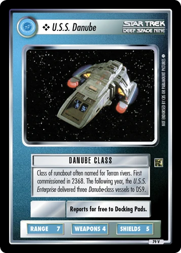 | Lore | Class of runabout often named for Terran rivers. First commissioned in 2368. The following years, the U.S.S. Enterprise delivered three Danube-class vessels to DS9. |