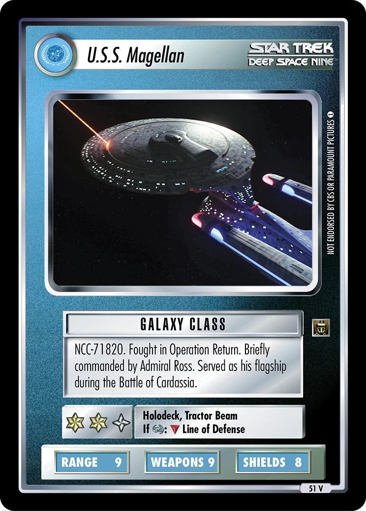 | Lore | NCC-71820. Fought in Operation Return. Briefly commanded by Admiral Ross. Served as his flagship during the Battle of Cardassia. |