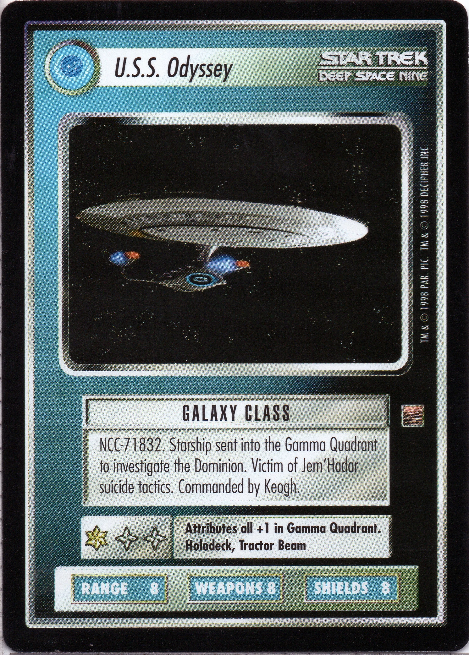 | Lore | NCC-71832. Starship sent into the Gamma Quadrant to investigate the Dominion. Victim of Jem'Hadar suicide tactics. Commanded by Keogh. |