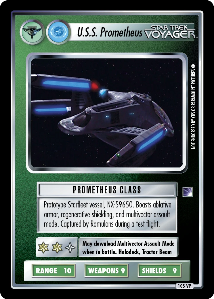 | Lore | Prototype Starfleet vessel, NX-59650. Boasts ablative armor, regenerative shielding, and multivector assault mode. Captured by Romulans during a test flight. |