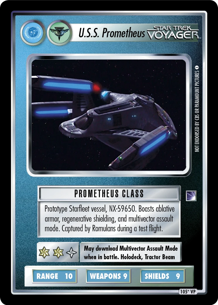 | Lore | Prototype Starfleet vessel, NX-59650. Boasts ablative armor, regenerative shielding, and multivector assault mode. Captured by Romulans during a test flight. |