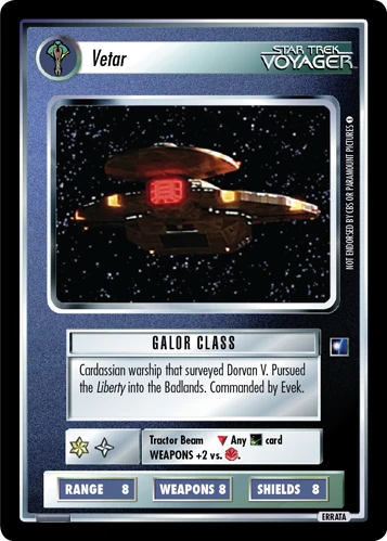 | Lore | Cardassian warship that surveyed Dorvan V. Pursued the Liberty into the Badlands. Commanded by Evek. |