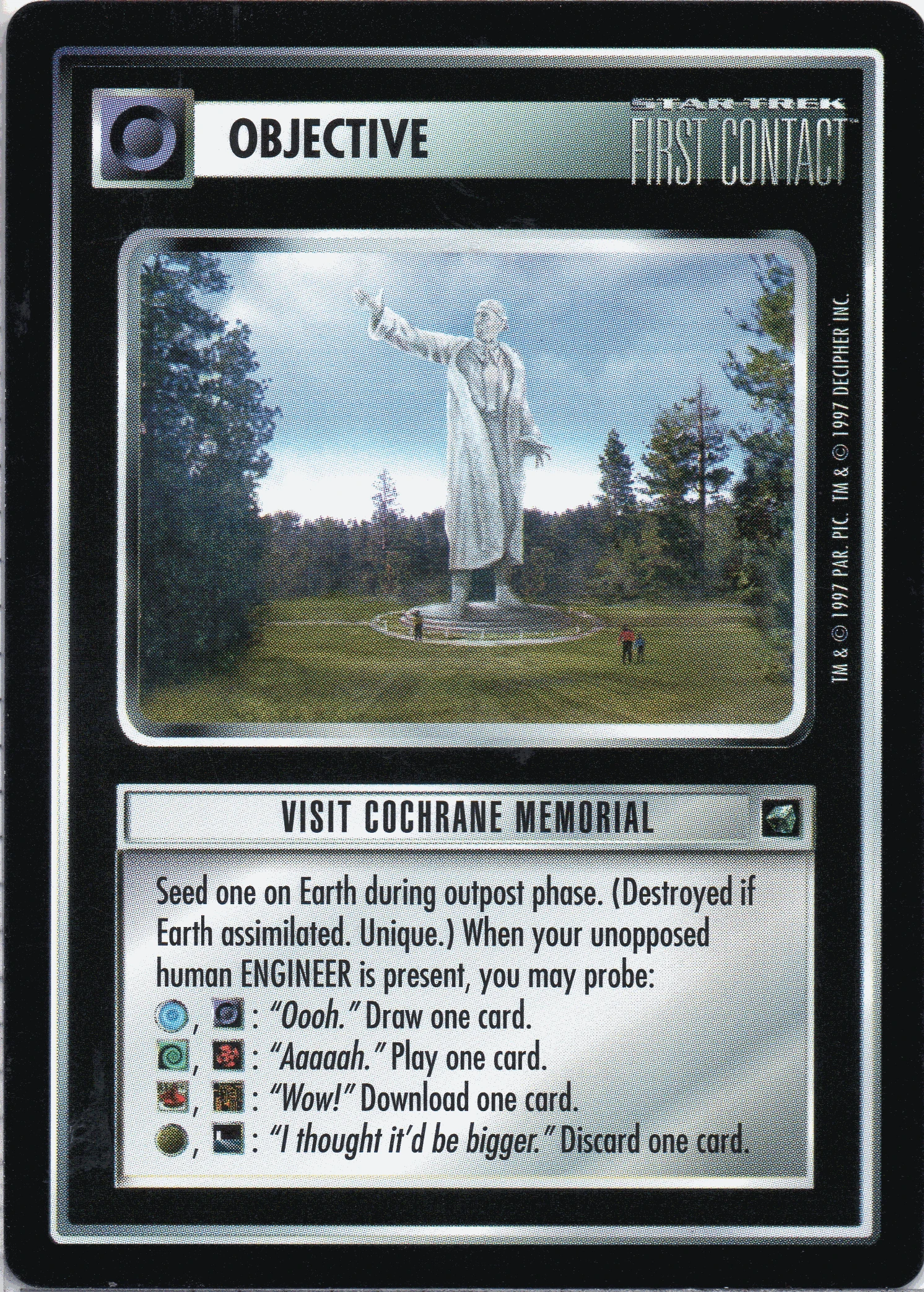 | Game Text (Errata) | Seed one on Earth during outpost phase. (Destroyed if Earth assimilated. Unique). When your unopposed human ENGINEER is present, you may probe: