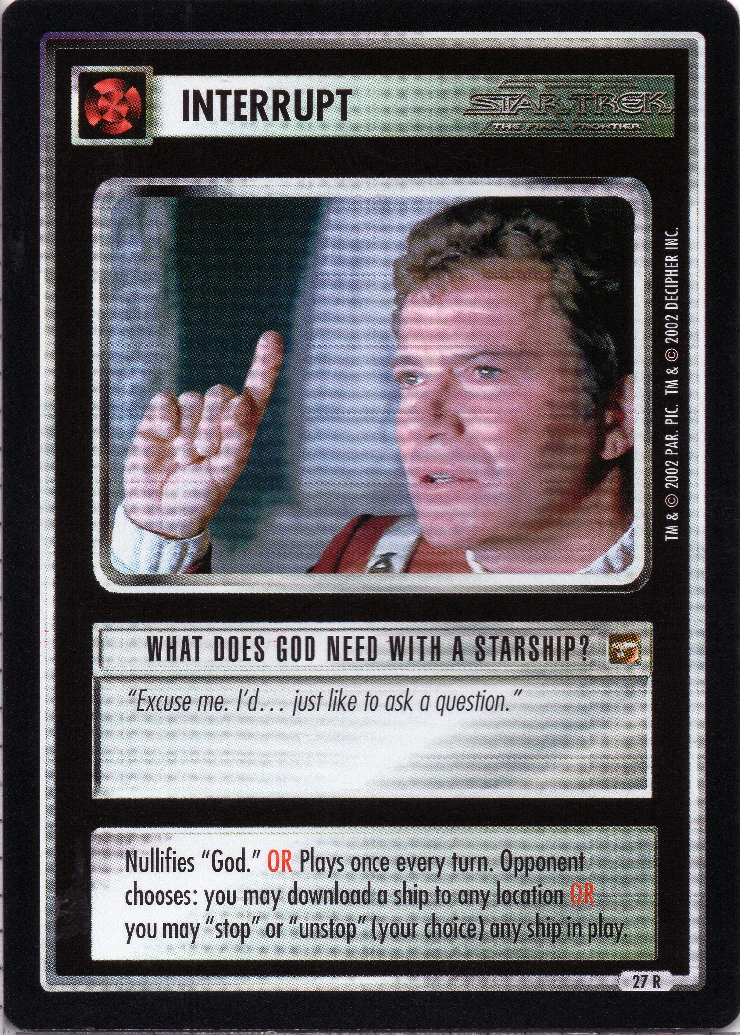 | Game Text (Errata) | Nullifies "God." (sic ) OR Plays once every turn. Opponent chooses: you may download a ship to any location OR you may "stop" or "unstop" (your choice) any ship in play. |