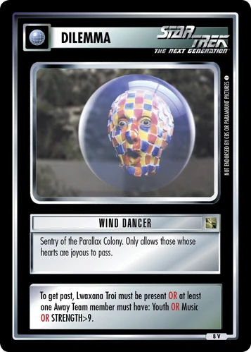 | Resolution Guide | If Away Team meets at least one condition (Lwaxana Troi in Away Team OR one Away Team member has (Youth OR Music OR STRENGTH>9)), discard dilemma. Mission continues. Otherwise, Away Team is stopped; reseed dilemma beneath mission. |