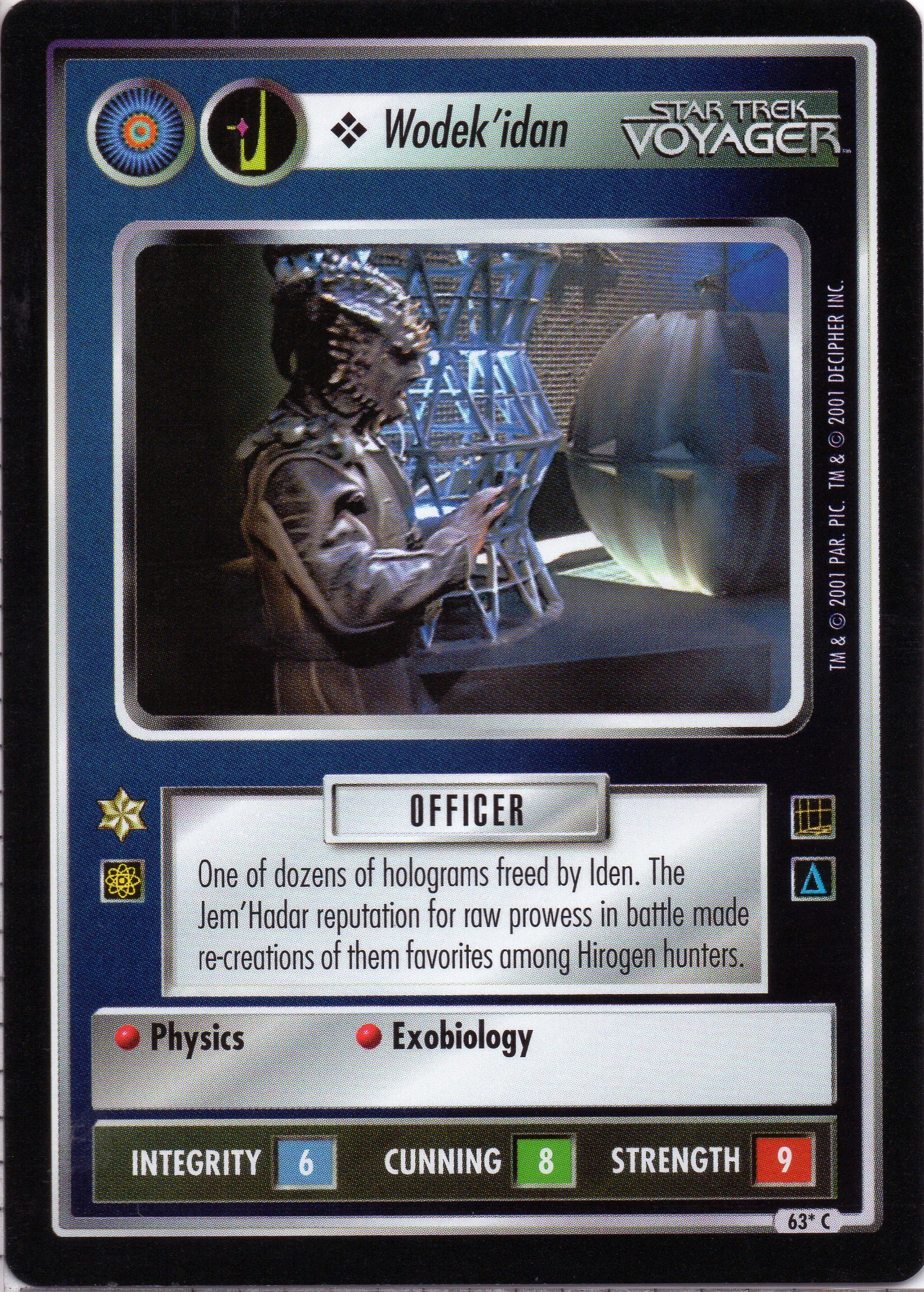 | Lore | One of dozens of holograms freed by Iden. The Jem'Hadar reputation for raw prowess in battle made re-creations of them favorites among Hirogen hunters. |