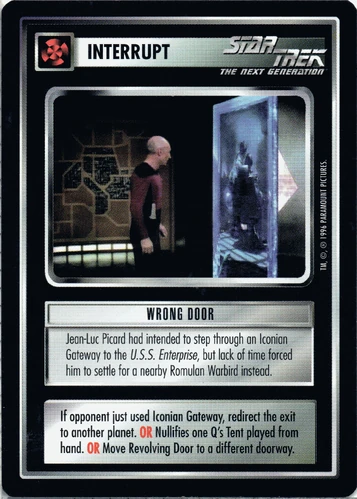 | Game Text (Errata) | If opponent just used Iconian Gateway, redirect the exit to another planet. OR Nullifies one Q's Tent played from hand. OR Move Revolving Door to a different doorway. |
