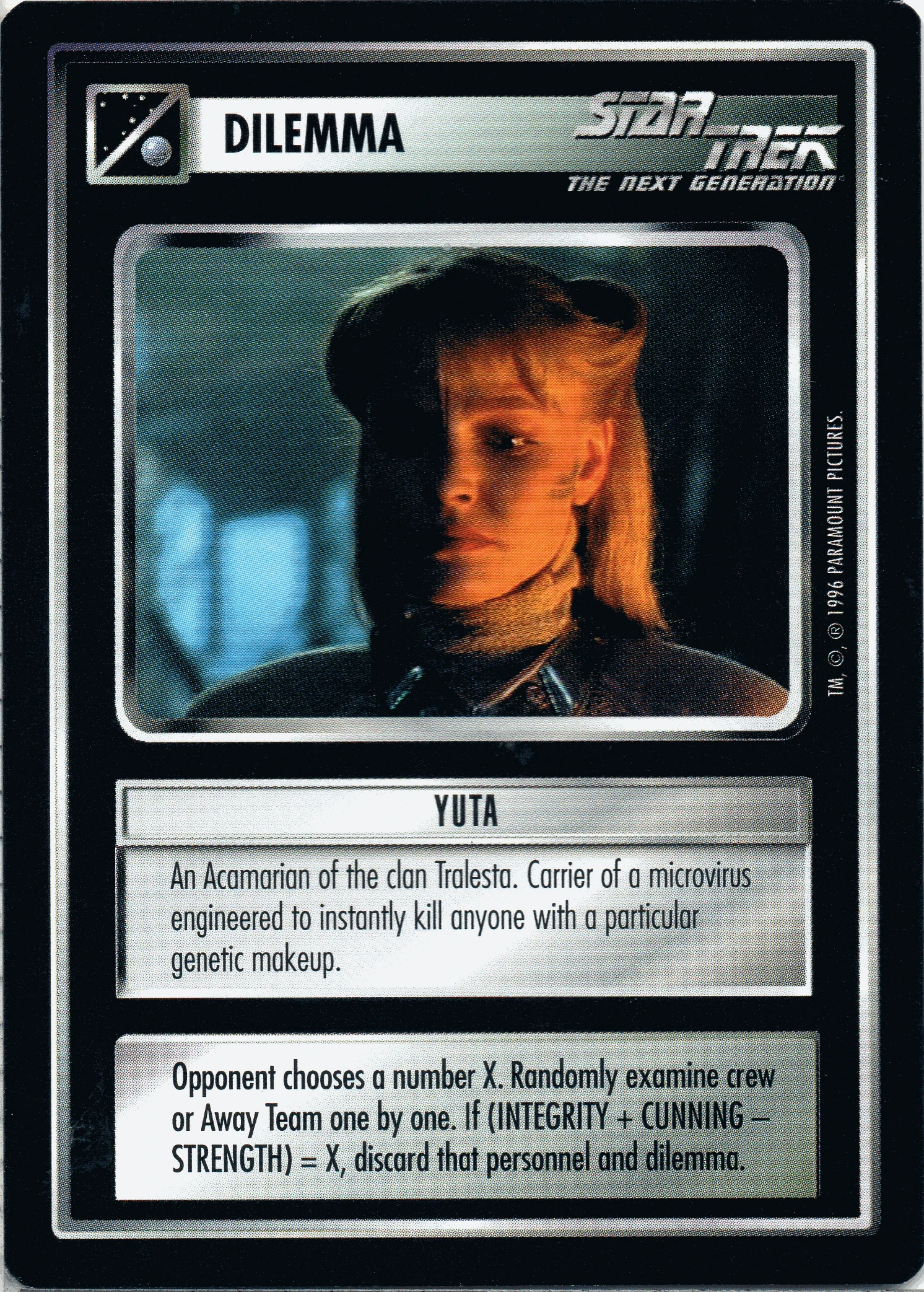 | Game Text | Opponent chooses a number X. Randomly examine crew or Away Team one by one. If INTEGRITY + CUNNING - STRENGTH) = X, discard that personnel and dilemma. |