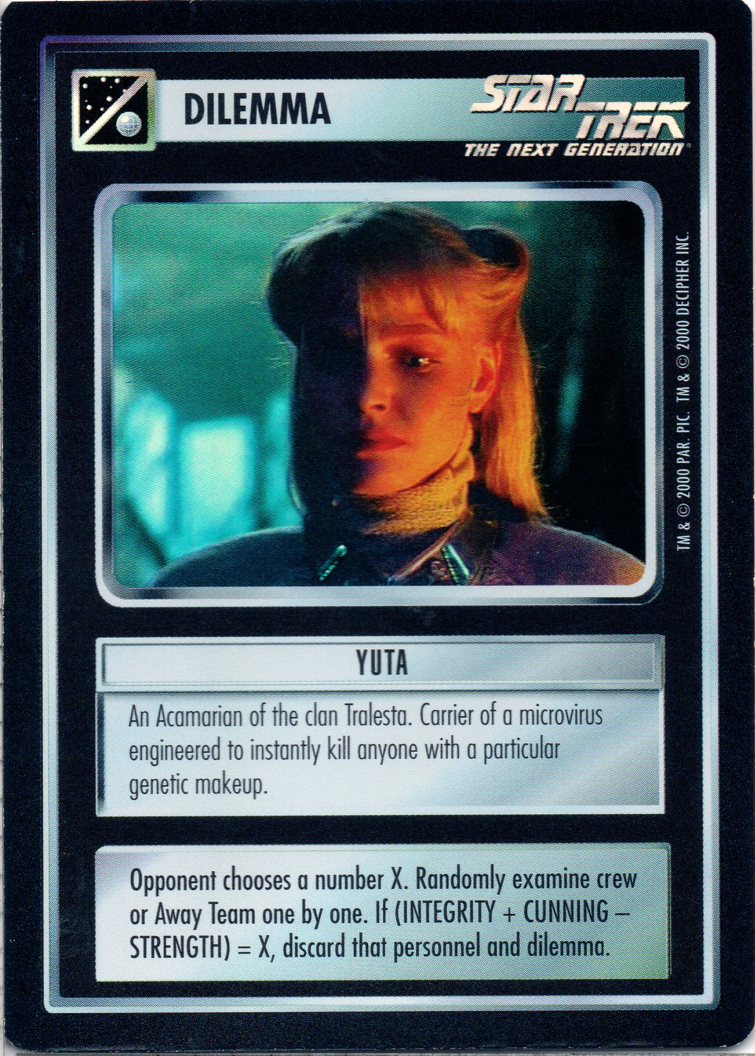 | Resolution Guide | Opponent chooses a number; X = chosen number. Randomly select a personnel from Away Team/crew and calculate their INTEGRITY+CUNNING-STRENGTH. If the Total = X, that personnel is killed, discard dilemma; mission continues. If the Total does not equal X, randomly select another personnel from Away Team/crew and repeat the process. Once you select a personnel whose Total = X, that personnel is killed, discard dilemma; mission continues. If no personnel in Away Team/crew have a Total = X after examining entire Away Team/crew, discard dilemma; mission continues. |